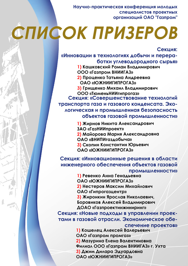 Sedovo settlement, Donetsk region hosted the Conference for Young Professionals "Innovative solutions in the field of gas and gas condensate production, transportation and processing", September 8 – 9, 2011. The participants of the event: JSC VNIPIgazdobycha, Saratov, GazNIIproekt ZAO, Samara, Gazproyektengineering, Voгonezh branch, JSC Giprogaztsentr, Nizhny Novgorod, JSC Giprospetsgaz, Saint-Petersburg, Neftegazgeodeziya Ltd. , Saint-Petersburg, GazpromVNIIGAZ Ltd., Moscow, JSC Gazprom Promgaz, Moscow, JSC Giprotyumenneftegaz, Tyumen, OJSC NIIgazekonomika, Moscow, TyumenNIIgiprogaz LLC. , Tyumen, JSC “YUZHNIIGIPROGAZ”, Donetsk.