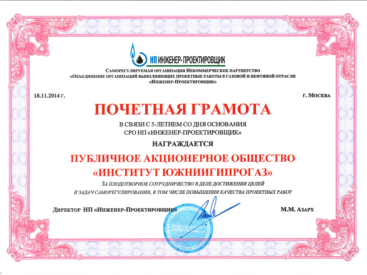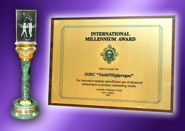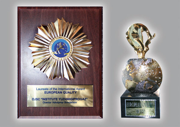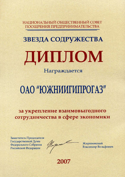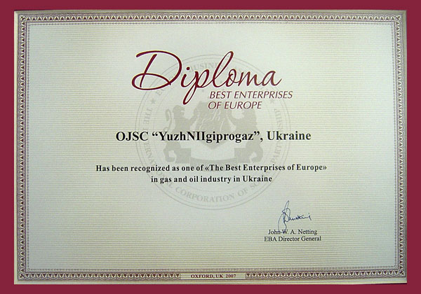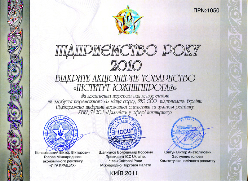 - В 2012 году, На основании официальных данных государственной статистики решением Оргкомитета Национального бизнес-рейтинга в Украине АО "ЮЖНИИГИПРОГАЗ" включено в ТОП-30 предприятий лидеров по совокупности показателей финансово-хозяйственной деятельности с присуждением звания "Лидер отрасли 2012";