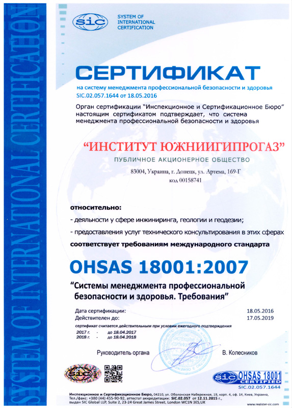- Система управления охраной труда – требованиям международного стандарта OHSAS18001:2007 (сертификат № SIC M.S. 001 644 от 20.05.2019).